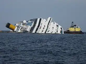 Крушение круизного судна «Коста Конкордия» — морская катастрофа, произошедшая в ночь с 13 на 14 января 2012 года в Тирренском море вблизи итальянского острова Джильо. Один из крупнейших европейских теплоходов[2][3] во время круиза по западному Средиземноморью с 4252 людьми на борту налетел на рифы, получил серьёзные повреждения и лёг на правый борт, при этом погибло 32 человека. Крушение случилось на пути следования из Чивитавеккьи в Савону. Это судно является самым большим пассажирским судном в истории, потерпевшим крушение.