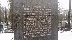 На месте катастрофы, на расстоянии около 120 метров к северу от остановочного пункта 90-й километр[4], в том же году был установлен обелиск в память о погибших. 31 августа 2006 года на месте обветшавшего первого обелиска был открыт новый монумент[3]. Совет ветеранов локомотивного депо Санкт-Петербург-сортировочный—Витебский выступил с предложением переименовать остановочный пункт 90 километр в платформу «Память мужества» — в честь подвига членов локомотивных бригад поездов, до конца выполнивших свой профессиональный и человеческий долг[3].