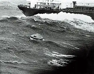 ![]() Пустая спасательная шлюпка парома «Эстония» в открытом море | |