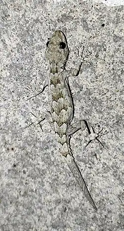 На верхней стороне и по бокам туловища и на верхних сторонах конечностей чешуйки мелкие, зернистые, гладкие или со слабо выраженными рёбрышками (на бёдрах задних ног ребристость немного более выражена, чем на передних). Однако среди них есть более крупные овальные, ребристые, выпуклые чешуйки — бугорки, расположенные 8—13, чаще всего 12, продольными рядами. Расстояние между отдельными бугорками в этих рядах примерно равно их ширине. Такие же бугорки есть на верхних сторонах конечностей. На брюхе чешуя гладкая, округлая и расположена черепицеобразно более-менее правильными продольными рядами, в которых насчитывается от 89 до 112 чешуек. Поперёк брюха располагается 22—30 чешуек. Под пальцами на конечностях имеются пластинки, количество которых 14—21. Хвост преимущественно покрыт обычными мелкими гладкими чешуйками. На верхней стороне передней половины хвоста между ними находятся особенно крупные шиповидные чешуи, расположенные поперечными рядами, придающими хвосту сегментированный вид. При этом «сегменты» соответствуют хвостовым позвонкам. Между шипиками в рядах и между самими рядами расположены мелкие чешуйки. Снизу хвост покрыт более-менее крупными гладкими многоугольными щитками, которые становятся всё более мелкими в направлении к концу хвоста. На одном «сегменте» их 1 или 2. Преанальных пор от 2 до 9, у самцов также есть 6 пар анальных пор. Постанальных бугорков по одному с каждой стороны[7][5].