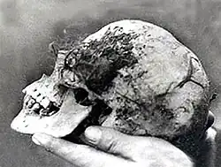 18 апреля 1943 года четверо местных мальчиков (Роберт Харт, Томас Уиллеттс, Боб Фармер и Фред Пейн), занимаясь браконьерством[2] и сбором яиц диких птиц в Хагли Вуд, части поместья Хагли, принадлежащего лорду Кобхэму[3][4], недалеко от Уичбери Хилл, наткнулись на большой вяз.[5][6] Решив, что дерево подходит для сбора яиц, Фармер попытался взобраться на него, чтобы осмотреть получше. Поднявшись, он заглянул в полую середину ствола и увидел череп. Сначала он решил, что это череп животного, но, увидев человеческие волосы и зубы, он понял, что это человеческий череп. Поскольку они находились на участке незаконно, Фармер положил череп обратно, и все четверо мальчиков вернулись домой, никому не сказав о своей находке[1]. Однако самый младший из мальчиков, Уиллеттс, почувствовал тревогу из-за увиденного и решил сообщить о находке своим родителям.