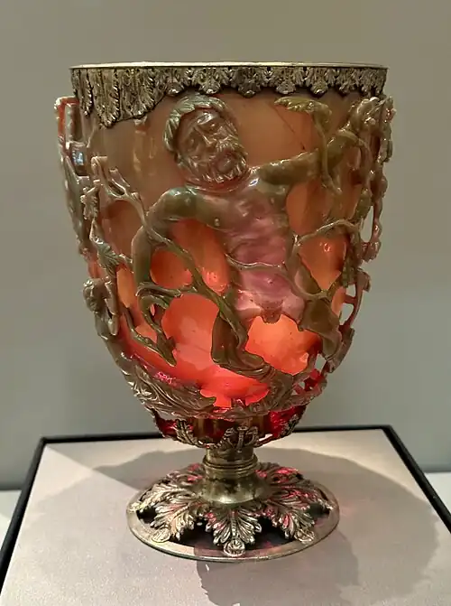 На стенках кубка изображена гибель фракийского царя Ликурга, которого за оскорбление бога вина Диониса опутали и задушили виноградные лозы. Существует гипотеза, что кубок был изготовлен в честь победы Константина над Лицинием и передавался из рук в руки вакхантами при дионисийских возлияниях. Во всяком случае, его необычная расцветка могла символизировать этапы созревания винограда.