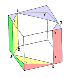 Части куба, оставшиеся после вырезания отверстия, образуют две треугольные призмы и два неправильных тетраэдра, связанные тонкими «мостиками» в четырёх вершинах квадрата. Каждая призма имеет шесть вершин, две из которых являются соседними вершинами куба, а остальные четыре вершины лежат на рёбрах куба (на расстоянии 1/4 от этих вершин). Каждый тетраэдр имеет одну вершину, совпадающую с вершиной куба, и три вершины, находящиеся на ребрах, выходящих из этой вершины (две на расстоянии 3/4, и одна на расстоянии 3/16 от неё)[5].