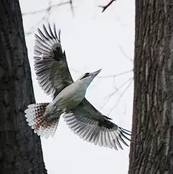 - Dacelo novaeguineae — Смеющаяся кукабара — птица среднего размера и плотного сложения. Её длина 45—47 см, размах крыльев 65 см; весит около 0,5 кг. Голова большая, с длинным клювом. В оперении (в отличие от остальных кукабарр) преобладают грязно-белые, серые и бурые тона. Внешность и голоса самцов, самок и птенцов старше 3 месяцев почти не отличаются.