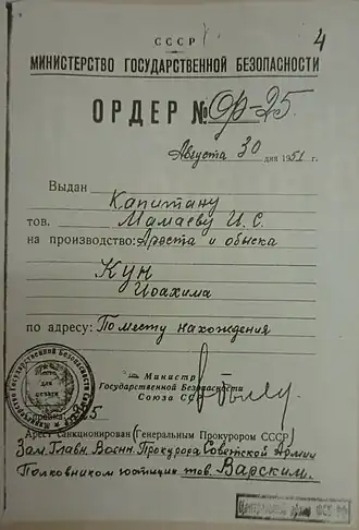 Советская сторона почти сразу заподозрила, что Кун — заброшенный вражеский агент. 23 сентября 1944 года начальник ГУКР Смерш генерал-полковник Виктор Абакумов писал Георгию Маленкову[4]: