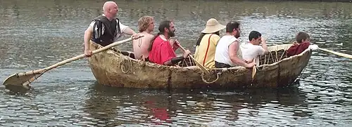 Изображённое судно около 6 метров длиной оборудовано килем и рулём (приспособленным с лодок с обшивкой из досок), с каркасом, сплетённым из ивы, и укреплённым шпангоутами. Обшивалась лодка, предположительно шкурами, после полного изготовления каркаса. Примерно в центре лодки устанавливалась мачта. Крепилась она двойными вантами к подобиям привальных брусьев расположенных снаружи борта и форштагом к форштевню. Фал форштага перекидывался через разветвление на вершине мачты чуть выше реи, на которой крепился прямой парус. На корме возвышались две перекрещенные дуги, которые могли служить для установки тента. Киль улучшал остойчивость судна, но корпус сохранял гибкость.
