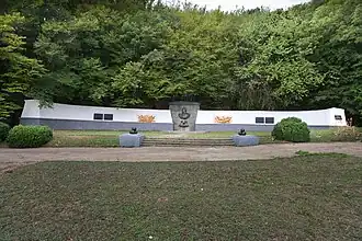 Вид после реконструкции 1956 года с добавленными памятными табличками. Опорная стена расширена, центральная стела понижена.- Стела и барельеф после реконструкции 1956 года. Архитектор А. Бабицкий, скульптор Л. С. Смерчинский.