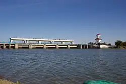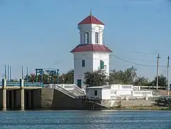 Водоподъёмная плотина доковой конструкции из железобетона установлена на металлических шпунтах, забитых в грунт на глубину 8 метров. 27-метровый водослив-водобой толщиной от 2,5 до 1,5 метра опускается до отметки 119 метров, завершаясь горизонтально идущим отрезком длиной 13 метров и толщиной 1,5 метра. Плотина имеет пять 16-метровых пролётов, перекрываемых затворами и аварийно-ремонтными шандорами (запорами для быстрого перекрытия потока жидкости в канале).