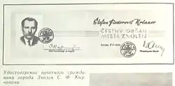 Почётный гражданин посёлка Томашевцы (Tomášovce) в Словакии, города Зволен в Чехии и села Касторное в Курской области .