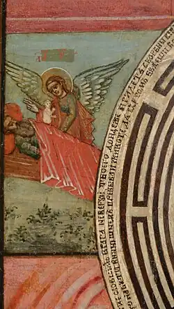 По обе стороны лабиринта находятся две сцены смерти — праведного человека и грешника. Праведник — почтенный человек в левой части с окладистой бородой в тёмно-зелёных одеждах под красным одеялом. Его душу, изображённую как фигурка младенца, принимает ангел также в красных одеждах[10]. Душу грешника (она также имеет вид младенца, а сам грешник — внешность безбородого мужчины) принимает чудовище в перьях с когтистыми лапами, в которых оно держит два свитка (Анастасия Долгова признавалась, что не смогла расшифровать написанный в них текст)[8].
