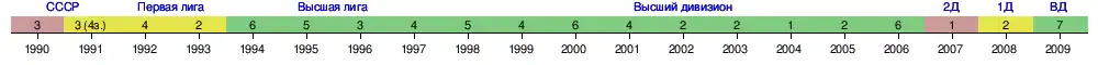 | 1995 | Высшая лига | — | 5 из 12 | 22 | 13 | 2 | 7 | 41 | 37 | +4 | 41 | снялся | не проводился | [8] | ||
