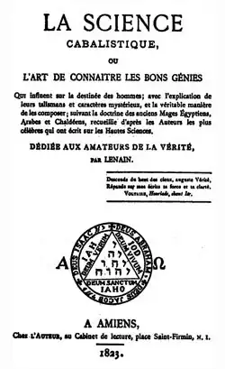 Lenain, «La Science cabalistique, ou l’art de connaître les bons génies qui influent sur la destinée des hommes; avec l’explication de leurs talismans et caractères mystérieux, et la véritable manière de les composer; suivant la doctrine des anciens Mages Égyptiens, Arabes et Chaldéens, recueillie d’après les Auteurs les plus célèbres qui ont écrit sur les Hautes Sciences», Paris, Éditions traditionnelles, 1963 (переиздания 1972, 1979, 1989)