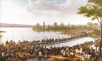 В ночь с 4 на 5 июля дивизия вошла на остров Лобау. 5 июля, около 8 часов утра, все дивизии Итальянской армии начали форсировать последний рукав Дуная. Как только они сформировались на противоположном берегу, они получили приказ двинуться на равнину Мархфельдта и следовать за движением маршала Даву. В половине седьмого вечера Богарне отдал приказ генералу Макдональду атаковать и ликвидировать вместе с дивизией Ламарка позиции противника на высотах между деревнями Баумерсдорф и Дойч-Ваграм. Движение Ламарка поддерживали две дивизии центрального корпуса. Эти высоты были усеяны и защищались многочисленной пехотой. Крутой канал, параллельный Рюссбаху, глубиной 2 метра и шириной 4 метра, прикрывал переднюю часть этой позиции. К атаке были подготовлены 7 батальонов дивизии Ламарка; 4 остались в резерве. Подойдя к каналу, французы оказались под смертоносным ружейным и картечным огнём, однако, смогли захватить позицию и обратили врага в бегство. Затем генерал опёрся на деревню Баумерсдорф и предпринял атаку по всему фронту позиции, которая увенчалась успехом. Генерал Макдональд энергично преследовал беглецов. Австрийцам подошла помощь, и они образовали каре. Макдональд немедленно призвал свой резерв и атаковал вражеские каре. Вся линия следовала импульсу, данному дивизией Ламарка; несколько австрийских каре бросили оружие. Французы собрали от 2 до 3 тысяч пленных и 5 флагов. Та же участь должна была постичь и другие каре противника, когда в тылу у французов началась сильная пальба. Причиной тому, жуткая неразбериха, когда французы перепутали саксонцев из 9-го корпуса Бернадотта с австрийцами, и открыли по ним огонь. Те ответили. Вскоре на помощь саксонцам пришла кавалерийская дивизия Саюка, что привело дивизии Макдональда в полное расстройство. Генералы тщетно пытались отозвать свои полки, они были вынуждены бросить пленных, а 5 гренадеров, несущих столько же вражеских флагов, были убиты. Французам удалось спасти только один флаг. Войска Итальянской армии с наступлением ночи расположились за каналом, где оставались до рассвета.