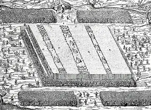 В отличие от испанской пехоты, ландскнехты придерживались, подобно швейцарцам, системы построения войск в три эшелона: авангард, главные силы и арьергард[11]. Тактической единицей являлся «значок», состоявший из 400-600 солдат, нанятых одним капитаном, 10-16 таких «значков», в каждом из которых было до 50 аркебузиров, составляли полк, который, однако, был не тактической, а административной единицей[12].