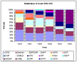 Выборы в Ландтаг Свободного государства Пруссия проводились в период с 1918 по 1933 год. С 1919 по 1928 год больше всего голосов и мандатов получала Социал-демократическая партия Германии (СДПГ), а в 1932 и 1933 годах на них побеждала Национал-социалистическая немецкая рабочая партия (НСДАП)[17][18]. Ниже приведена обзорная таблица выборов в ландтаг с 1919 по 1933 год[19]: