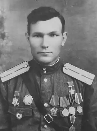 - ↑ Наградные документы в электронном банке документов «Подвиг народа» (архивные материалы ЦАМО. Ф. 33. Оп. 686044. Д. 119. Л. 3, 44, 45)..