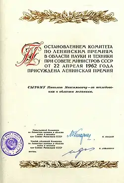 6. Архив РАН. Ф.1713. Оп.2. Д.16. Диплом лауреата Ленинской премии, принадлежавший Миллионщикову М. Д. Подлинник.