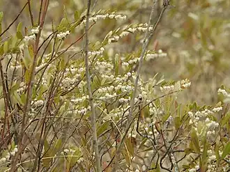В понижениях, ложбинах стока, на небольших лесных болотах среди елово-сосновых лесов, пересеченных сетью старых дренажных канав, нередки заболоченные березняки с ивой пепельной, местами — с ольхой чёрной, осиной влажнотравно-камышовые с таволгой вязолистной, вейником сероватым, осокой носиковой, тростником южным, паслёном сладко-горьким, хвощами луговым или речным, вербейником обыкновенным, куманикой, молинией голубой, фиалкой болотной, сфагновыми и долгими политриховыми мхами.