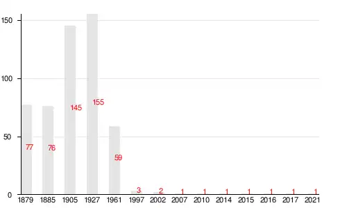 | 1879 | 1885 | 1905 | 1927 | 1961 | 1997 | 2007[18] |