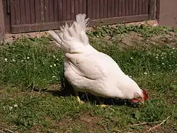 Бурый леггорн. Эту птицу называют также итальянскими куропатчатыми курами. Порода выведена в Италии и относится к яичным курам. Бурым леггорнам характерен половой диморфизм в окраске оперения. Шея и спина у петуха разных оттенков золотисто-красного цвета. Грудь, живот и хвост — чёрные с металлическим зелёным блеском. Курица имеет более скромную, защитную окраску оперения[6].