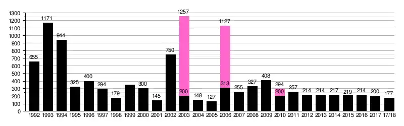 - Посещаемость домашних матчей «Легенды» в чемпионатах и кубках Украины (чёрный цвет), во всех официальных турнирах с учетом еврокубков (розовый цвет)[117]. Среднее количество зрителей на игре в течение сезона: