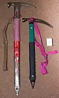 От ледового молотка айсбайль отличает меньший изгиб клюва, большая длина рукоятки и наличие штычка.