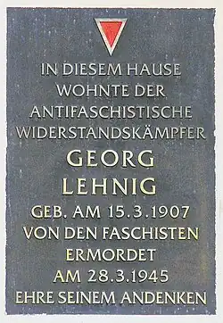 Механик и столяр по профессии, уроженец Лихтенберга Георг Лениг в юности состоял в Коммунистическом союзе молодёжи Германии, в 1927 году вступил в Коммунистическую партию Германии. Провёл девять месяцев в СССР. По возвращении Лениг по поручению партии работал инструктором и курьером в Восточной Пруссии и Литве. В 1933 году был арестован в Кёнигсберге и помещён в концентрационный лагерь. В отсутствие доказательств был освобождён из заключения, работал на кабельном заводе и участвовал в сопротивлении национал-социализму, распространяя листовки, адресованные иностранцам, занятым на принудительных работах.