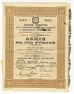 Акция в 100 руб. на предъявителя Русского общества для изготовления снарядов и военных припасов. С.-Петербург, 1913 г.[1]
