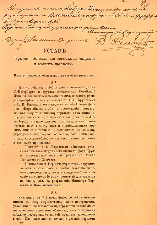 Устав Русского общества для изготовления снарядов и военных припасов «Парвиайнен», в дальнейшем — Ленинградский механический завод им. К. Либкнехта
