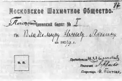 Шахматы как общественное явление иногда привлекали внимание руководителя советского правительства в годы гражданской войны и нэпа. В октябре 1918 года на встрече с руководителями комсомола Ленин неожиданно задал вопрос: «Играют ли комсомольцы в шахматы?»[60]. В 1922 году Московское шахматное общество избрало Ленина своим почётным председателем, ему переслали почётный членский билет под номером 1[61].