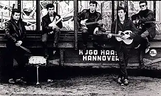 Маккартни предложил взять в качестве соло-гитариста своего друга Джорджа Харрисона[66]. Леннон изначально считал, что он слишком молод, так как на тот момент ему было всего 14 лет. Маккартни устроил прослушивание на верхнем этаже ливерпульского автобуса, где Харрисон сыграл для Леннона песню «Raunchy» и был принят в группу[67]. Стюарт Сатклифф, друг Джона по колледжу искусств, позднее был приглашён в качестве басиста[68]. Леннон, Маккартни, Харрисон и Сатклифф переименовались в The Beatles в начале 1960 года[комм. 5]. В августе того же года музыканты получили контракт на 48 выступлений в Гамбурге. Так как группе срочно был нужен барабанщик, они попросили присоединиться к ним Пита Беста[71]. Тётя Мими пришла в ужас, когда Леннон рассказал ей о предстоящей поездке, и умоляла Джона продолжить обучение в колледже[49]. После первой поездки в ФРГ группа получила повторное приглашение в апреле 1961 года и вновь отравилась в Гамбург в апреле 1962 года. Как и другие битлы, во время этих гастролей Леннон впервые попробовал пре́людин[комм. 6][72] и регулярно принимал наркотик в качестве стимулятора во время продолжительных ночных выступлений[73].