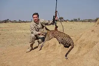 Во многих странах Африки относительно высокая численность леопардов позволяет выделять ежегодно квоту на их добычу. Стоимость трофея леопарда составляет от $4 тыс. до $12 тыс. На леопарда обычно охотятся у привады, в качестве которой используется туша небольшого животного (павиана, антилопы и т. д.). Туша должна быть достаточно свежей, потому что леопард (как и другие кошачьи и, в отличие от, например, медведей), избегает разложившейся падали. Привада привязывается к одной из нижних ветвей одиноко стоящего дерева, часто посещаемого леопардом так, чтобы она была хорошо видна на фоне закатного неба. Стрелять приходится быстро и на близком расстоянии. Раненый леопард исключительно опасен, он чаще нападает, чем старается уйти. Кроме того, он часто притворяется мёртвым и бросается на подошедшего охотника[43].