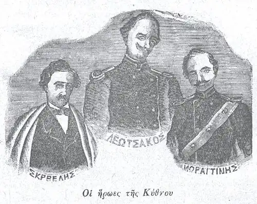 Захватив в порту острова пароходы «Оттон» и «Картериа», революционеры отправились на близлежащий остров Тинос. Встретив сопротивление на Тиносе, революционеры на пароходе «Картериа» отправились на остров Китнос, освобождать арестованных 1 февраля в Афинах полицией Оттона и сосланных на Китнос. При выходе из Китноса «Картериа», с революционерами и освобождёнными на борту, встретилась с «Амалия (паровой фрегат)», с ротой правительственных войск на борту. «Картериа» вернулась в гавань. На берегу вокруг Леотсакоса, Морайтиниса и освобождённого 19-летнего младшего лейтенанта Скарвелиса осталось только 18—20 человек. Леотсакос и его соратники отказались сдаваться. В последовавшем бою Леотсакос, Морайтинис и Скарвелис погибли[6][7].