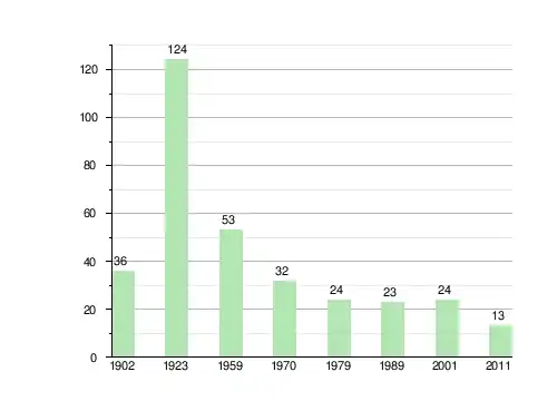 | 1902[3] | 1923[4] | 1959[5] | 1970[5] | 1979[6] | 1989[7] | 2001[8] | 2011[9] |