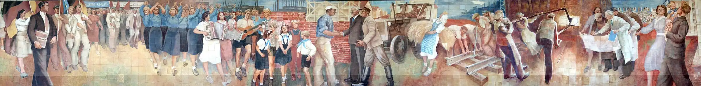 - ↑ Сюжет монументальной композиции визировал премьер-министр ГДР, и художнику потребовалось пять попыток и бессчётное число исправлений в теле авторского замысла. Изображение переведено по эскизам Лингнера на керамическую плитку с помощью трафаретной печати. Исполнитель — Фабрика фарфора Мейсен.