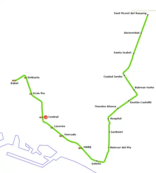 Линия 2 (Метрополитен Аликанте) соединяет центр Аликанте с югом Сан висенте дель Распеч и Университетом Аликанте. На подземных станциях Marq, Mercado и Luceros есть возможность пересадки на Линию 1, Линию 3 или Линию 4[4][5] В будущем планируется продолжить линию под землей от станции Luceros до станции Babel проходя через станции Central, Gran Vía и Orihuela.