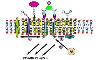 Последовательность событий этого сигнального пути такова. Сначала IgE связывается с Fc-эпсилон рецепторами, находящимися в плазматических мембранах тучных клеток и базофилов, через их Fc-сегмент. Тетрамер FcεR состоит из одной α-, одной β- и двух γ-цепей[28]. Сначала один тетрамер FcεR связывается с одной молекулой IgE. С IgE связывается α-цепь, а три другие цепи содержат активационный тирозиновый мотив иммунных рецепторов (англ. immune receptor tyrosine-based activation motifs (ITAM)). Далее олигомерный антиген связывается с несколькими молекулами IgE, уже связанным к тому моменту с FcεR, сшивая вместе два или более рецепторных комплексов. После такого соединения для фосфорилирования ITAM двух рецепторов привлекается дважды ацетилированная нерецепторная Src-подобная тирозинкиназа Lyn. Далее тирозинкиназа семейства Syk связывается с фосфотирозиновыми остатками ITAM (результат работы Lyn) и начинает сигнальный каскад[26][27]. Syk, в свою очередь, может активировать другие белки, например, LAT. Белки LAT, связываясь друг с другом, могут рекрутировать в рафт другие белки и дополнительно амплифицировать (усиливать) сигнал[32].