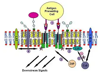 Т-клеточный антигеновый рецептор (TCR) — это молекула, имеющаяся на поверхности Т-лимфоцитов (Т-клеток). Он включает в себя αβ-гетеродимер, CD3- (γδε) комплекс и ξ-гомодимер. α- и β-субъединицы содержат внеклеточные сайты связывания для пептидов, которые представлены на белках главного комплекса гистосовместимости (МНС) I и II классов, расположенных на поверхности антигенпрезентирующих клеток (APC). CD3- и ξ-субъединицы содержат цитоплазматические мотивы ITAM. При передаче сигнала молекулы MHC связываются с TCR, соединяя два или более рецептора вместе. Такое соединение рецепторов, как и в сигнальном пути IgE, рекрутирует дважды ацетилированные нерецепторные Src-подобные тирозинкиназы для фосфорилирования мотивов ITAM. TCR привлекает не только тирозинкиназу Lyn, но и Fyn[23][33]. После этого белок ZAP-70, не участвующий в сигнальном пути IgE, связывается с фосфорилированными ITAM, благодаря чему активируется сам и активирует LAT. Активация LAT даёт амплификацию сигнала. Другое отличие сигнального пути TCR от сигнального пути IgE заключается в том, что TCR активируют белок Lck, что может приводить к более сильной кластеризации рафтов[34][35] и тем самым дополнительно усиливать сигнал. Одним из возможных механизмов отрицательной регуляции этого пути может быть связывание цитозольной киназы Csk с ассоциированным с рафтами белком CBP. После этого Csk может подавлять работу киназ семейства Src через фосфорилирование[36].