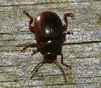 Длина тела имаго 6,2—8,1 мм[7]. Жуки красновато-коричневые с более бледными придатками[7] и слабым бронзовым отблеском[10]. Прикраевая линия переднеспинки сильно вдавленная. На надкрыльях нет бороздок, но у некоторых особей пунктировка надкрылий образуют более или менее видимые бороздки[7].
