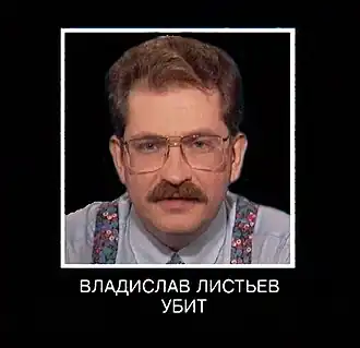 - ↑ Ирина Петровская. Какая разница, за что его убили?. — Известия, 1996-03-02. — «Год назад убили Владислава Листьева. Не забыть его портрет в чёрной немой рамке экрана — на всех каналах. Не забыть лаконичный, леденящий душу титр: "Владислав Листьев убит"».