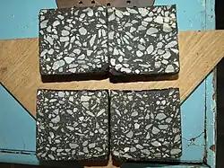 - ↑ В верхнем ряду структура литого асфальтобетона тип 1 с крупностью щебня не более 15 мм. В нижнем ряду представлен разрез образца литого асфальтобетона тип 2 с крупностью щебня не более 10 мм