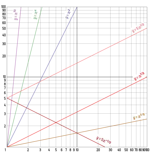 На логарифмической бумаге графики степенных функций типа имеют вид прямых, поскольку путём логарифмирования степенная зависимость приводится к линейной: . Наклон прямой (угловой коэффициент) определяется показателем степени b. При эта функция возрастающая, а при убывающая; при прямая горизонтальна, . Точка пересечения прямой с осью ординат определяется коэффициентом a. В частности, при графики представляют собою прямые, проходящие через начало координат: .