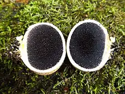 Глеба светлая, желтовато-белая, с возрастом темнеет, начиная с середины плодового тела, до фиолетово-чёрной или чёрной с белыми прожилками; долгое время остаётся плотной, пока при полном созревании гриба не распадается на серовато-желтые стерильные участки и оливково-бурый споровый порошок. У молодых грибов зачастую имеет отчётливый пряный запах (похожий на запах сырого картофеля); вкус не выраженный.