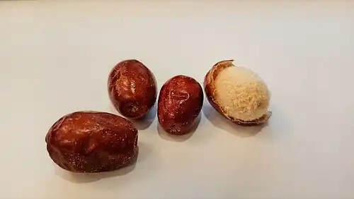 β. inermis. П ш а т ъ (съ арм.) Армянскіе или Бухарскіе, или Кавказскіе, или Китайскіе, или Туркменскіе финики. — Арм. Pschatt. — Груз. Пшати (Эр.) — Турк. Igda (Buhs.) — Перс. Ssedschit (Buhs.) — Плоды иногда наз. Жужубой по смешенію съ плодами Zizyphus. Они съѣдобны и довольно вкусны. Киргизы приготовляютъ изъ нихъ муку и варятъ изъ нихъ родъ компота, который славится у нихъ полезнымъ отъ поноса.[2]