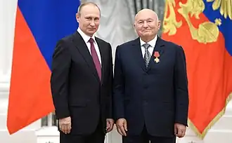 - ↑ Указ Президента Российской Федерации от 19 сентября 1996 года № 1375 «О присвоении почётного звания „Заслуженный строитель Российской Федерации“ Лужкову Ю. М.» Дата обращения: 17 апреля 2019. Архивировано 17 апреля 2019 года.