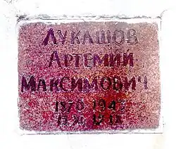 - ↑ На мемориальной табличке на памятнике Лукашову А. М. ошибочно был выбит «1943 г.»
