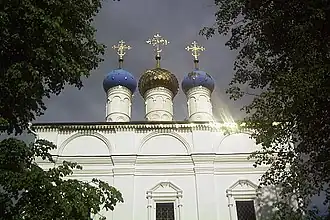 2. Церковь во имя Богоявления Господня. Когда и кем построена была эта церковь, неизвестно. Известно только из грамоты Патриарха Иоакима, что она в 1680 году была ветхая деревянная и что в этом же году строитель иеромонах Корнилий просил у Патриарха построить вместо её новую каменную с приделом во имя Великомученика Феодора Стратилата.