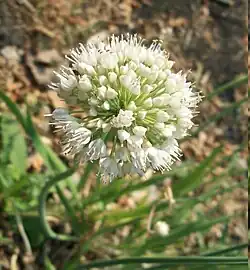 Зонтик шаровидный, реже почти шаровидный, многоцветковый, густой, почти головчатый, до цветения поникающий. Листочки полушаровидного околоцветника розовые или розово-фиолетовые с мало заметной жилкой, длиной 4–6 мм, тупые, продолговато-яйцевидные, внутренние немного длиннее наружных лодочковидных. Нити тычинок при самом основании между собой и с околоцветником сросшиеся, в полтора-два раза длиннее листочков околоцветника, шиловидные, внутренние при основании обычно двузубые, в 2 раза шире наружных. Столбик выдается из околоцветника.