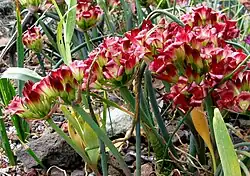 Цветоносы прямые, одиночные, твёрдые, круглые в сечении, 10–20 см высотой и до 0,5 см в сечении[1]. На стрелке находится зонтик из 12–30 колокольчатых цветков, каждый шириной чуть более сантиметра. Шесть блестящих листочков околоцветника имеют цвет от тёмно-бордового до насыщенно-розового и могут быть белыми у основания. Листочки околоцветника изогнуты и закручиваются наружу от центра цветка, что уникально для луков[4]. Пыльники жёлтые[1].