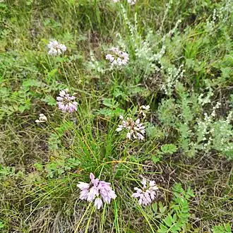 Чехол в два раза короче зонтика, коротко-заострённый, остающийся. Зонтик полушаровидный, реже почти шаровидный, немногоцветковый, густой. Листочки широко-колокольчатого околоцветника тёмно-розовые с мало заметной жилкой, длиной 5—6 мм, внутренние продолговато-эллиптические, почти линейно-продолговатые, тупые, почти усечённые, наружные короче внутренних, продолговато-яйцевидные, тупые. Нити тычинок немного короче листочков околоцветника, при самом основании между собой и с околоцветником сросшиеся. Столбик не выдается из околоцветника.